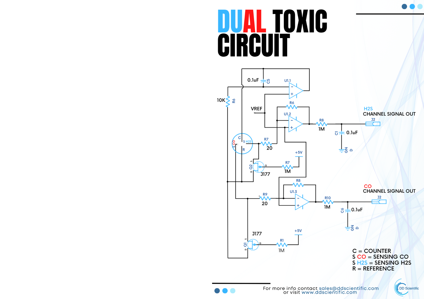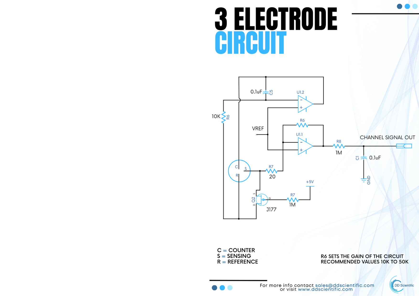 3 电极电路用于与 DD-Scientific 毒性传感器配合使用的多种 PCB 设计中,并配备了参考电极。